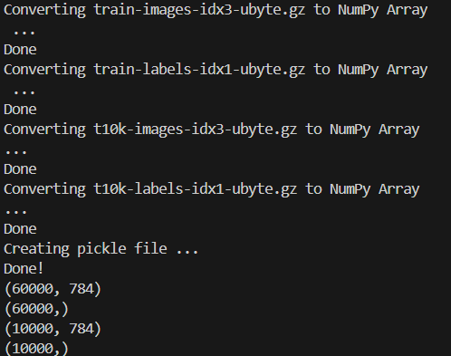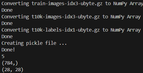 - load_mnist 함수는 읽은 MNIST 데이터를 "(훈련 이미지, 훈련 테이블),(시험 이미지, 시험 레이블)" 형식으로 변환한다