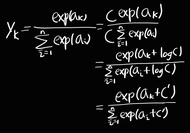- 하지만 이대로 계산하면 지수함수에서 오버플로가 발생하기 때문에 아래와 같은 식으로 계산해야 오류가 나지 않는다